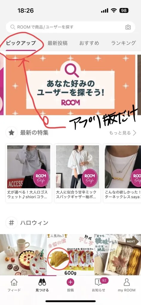 ピックアップタグとは、楽天ROOMアプリの「見つける」タブに表示される特別なコーナーのことです。